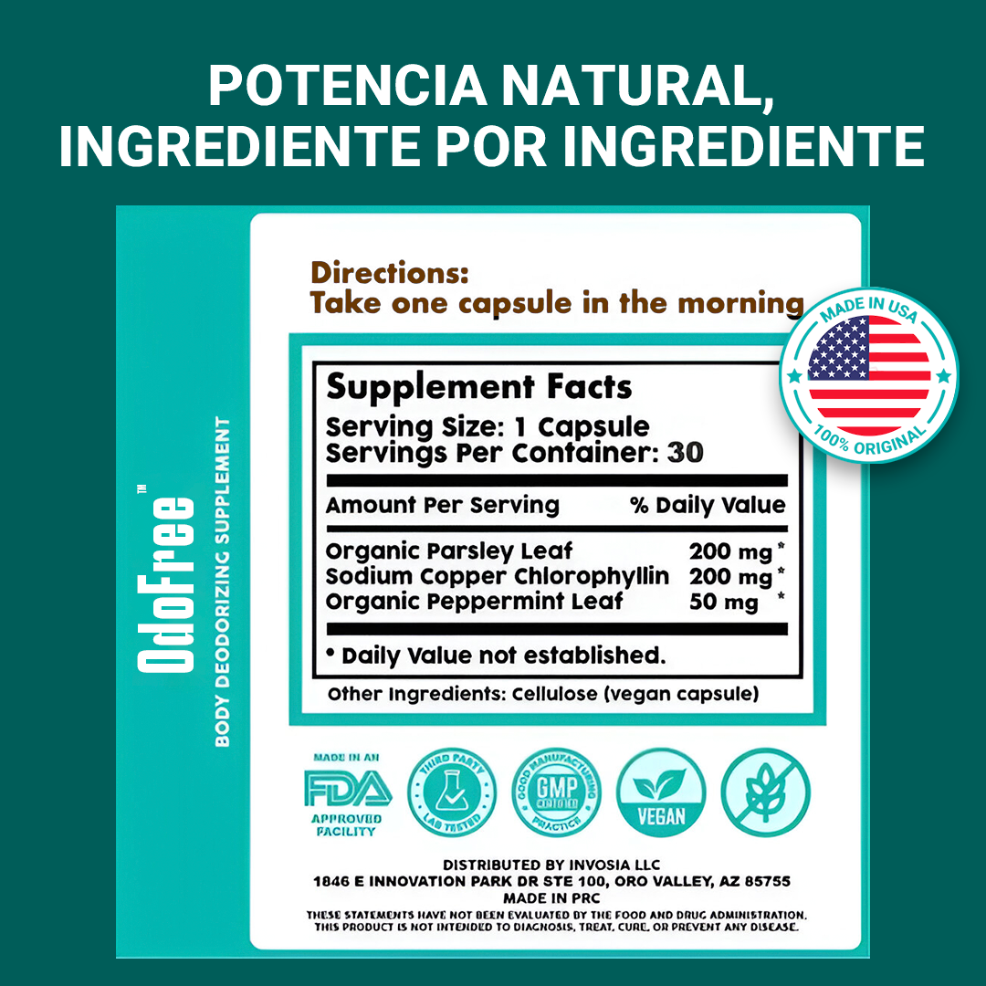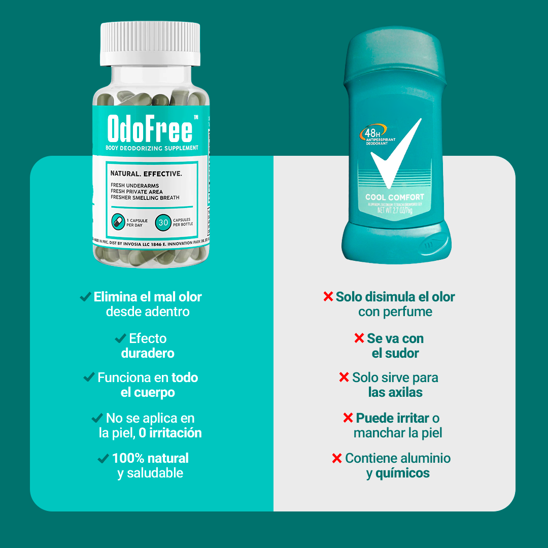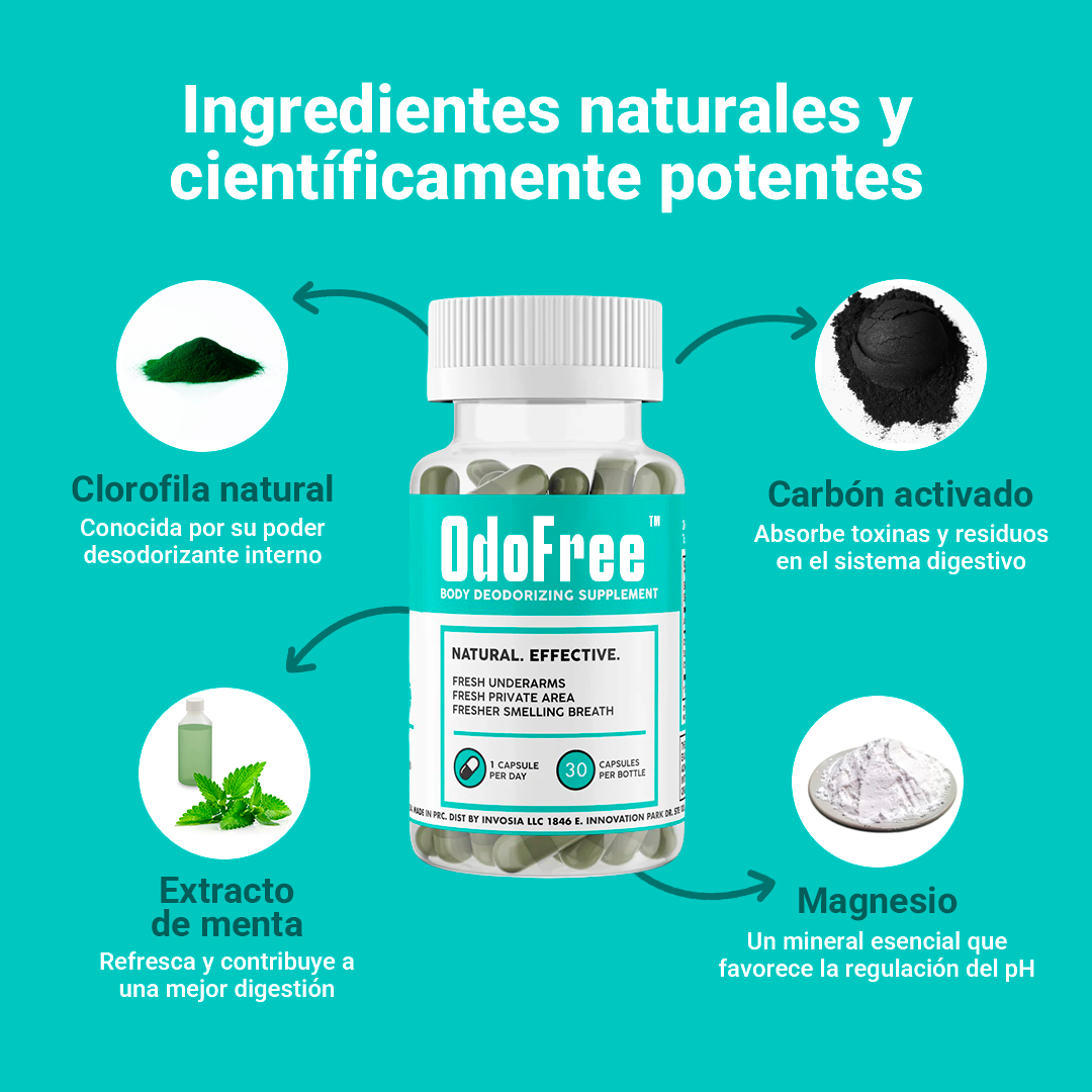 OdoFree™ no solo combate olores… también desintoxica el intestino, mejora la flora, regula el pH íntimo y potencia la energía natural del cuerpo. ¡Es un reset total para sentirte fresco de adentro hacia afuera!